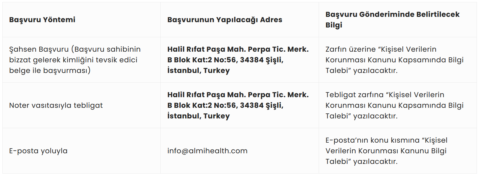 KVKK Kanunu’nun 13’üncü maddesinin birinci fıkrası uyarınca; veri sorumlusu olan almi Sağlık Turizm Seyahat Acentası bu haklara ilişkin olarak yapılacak başvuruların yazılı olarak veya Kişisel Verilerin Korunması Kurulu (“Kurul”) tarafından belirlenen diğer yöntemlerle tarafımıza iletilmesi gerekmektedir.