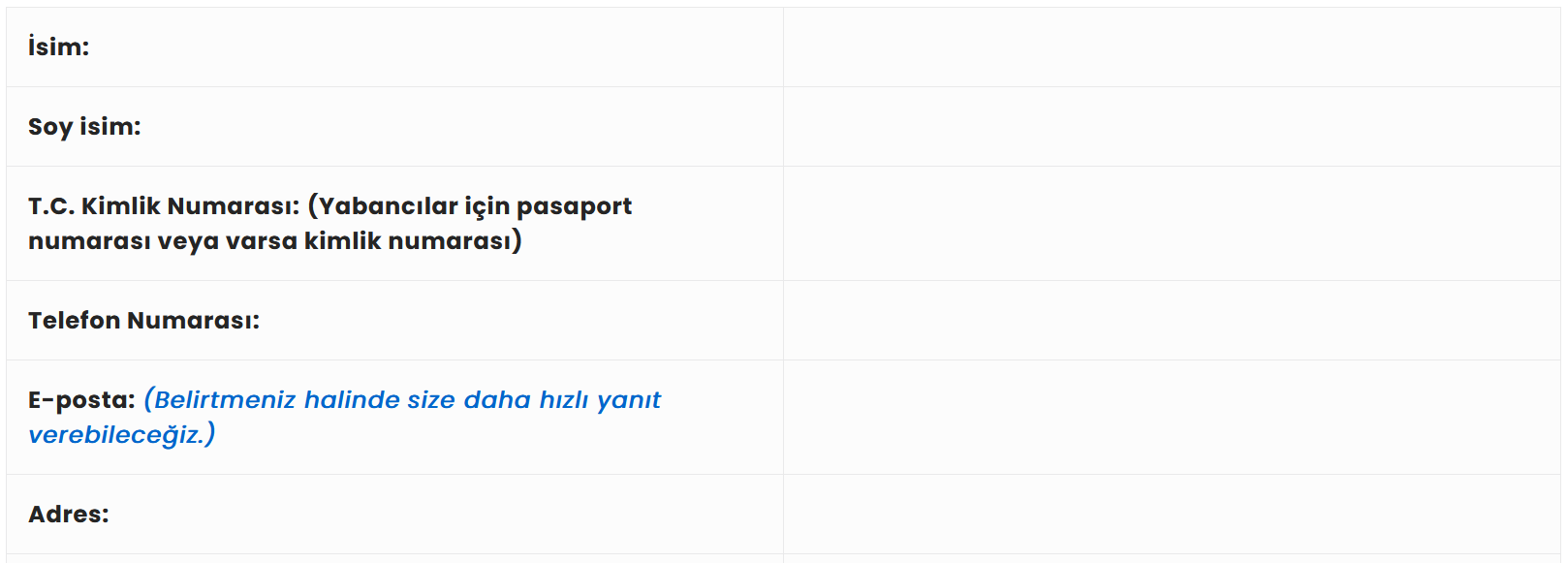 İşbu başvuru formu, şireketimiz ile olan ilişkinizi tespit ederek, varsa, şirektimiz tarafından işlenen kişisel verilerinizi eksiksiz olarak belirleyerek, ilgili başvurunuza doğru ve kanuni süresinde cevap verilebilmesi için tanzim edilmiştir. Hukuka aykırı ve haksız bir şekilde veri paylaşımından kaynaklanabilecek hukuki risklerin bertaraf edilmesi ve özellikle kişisel verilerinizin güvenliğinin sağlanması amacıyla, kimlik ve yetki tespiti için şireketimiz ek evrak ve malumat (Nüfus cüzdanı veya sürücü belgesi sureti vb.) talep etme hakkını saklı tutar. Form kapsamında iletmekte olduğunuz taleplerinize ilişkin bilgilerin doğru ve güncel olmaması ya da yetkisiz bir başvuru yapılması halinde şirketimiz, söz konusu yanlış bilgi ya da yetkisiz başvuru kaynaklı taleplerden dolayı sorumluluk kabul etmemektedir.